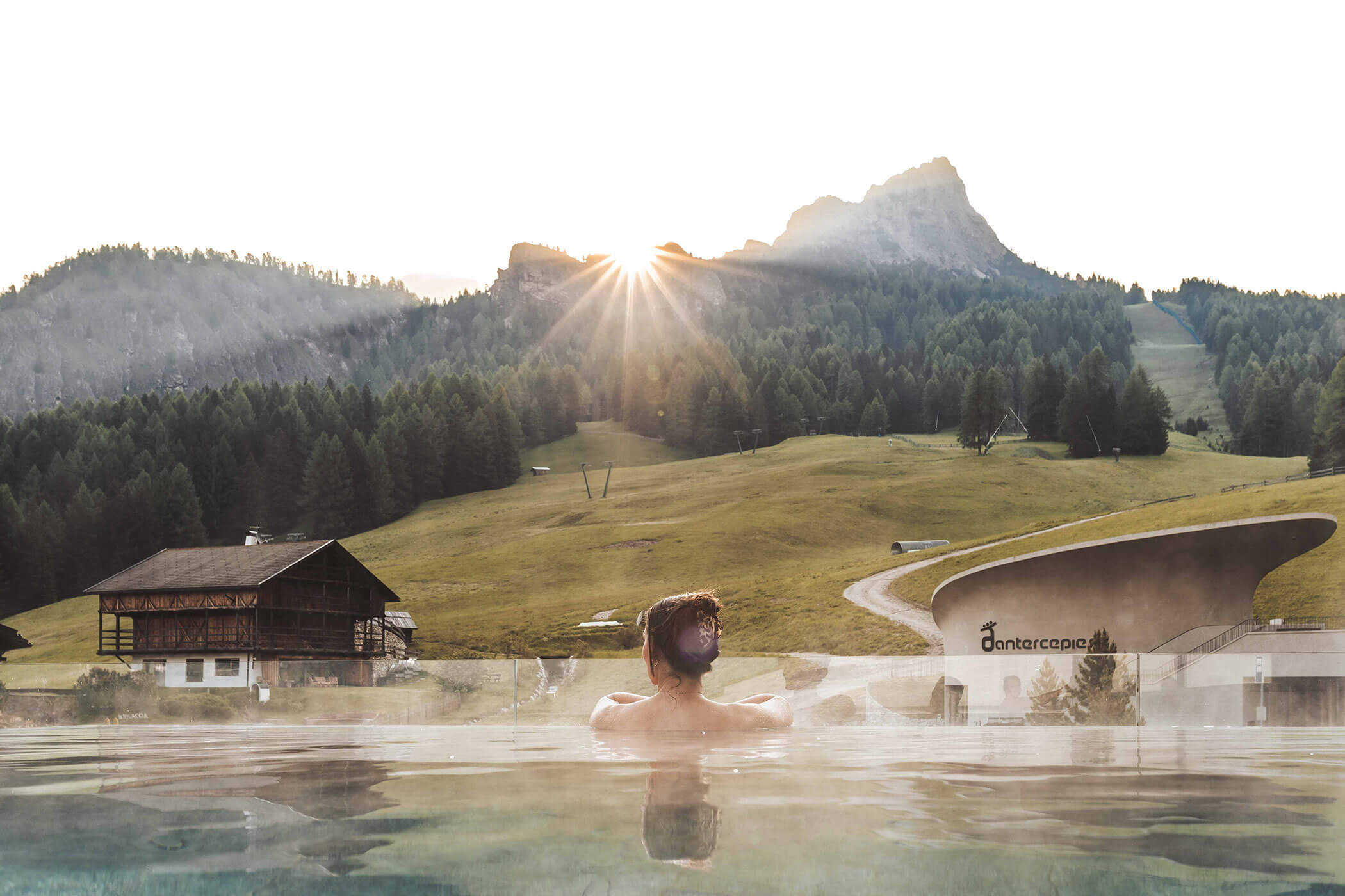 Prendere il sole in piscina Hotel benessere Piscina con vista sulle piste da sci Hotel con piscina in inverno Piscina con vista sul paesaggio invernale Tramonto nelle Dolomiti Vista sulle montagne dalla piscina Famiglia in piscina Piscina in estate Piscina con vista in estate
